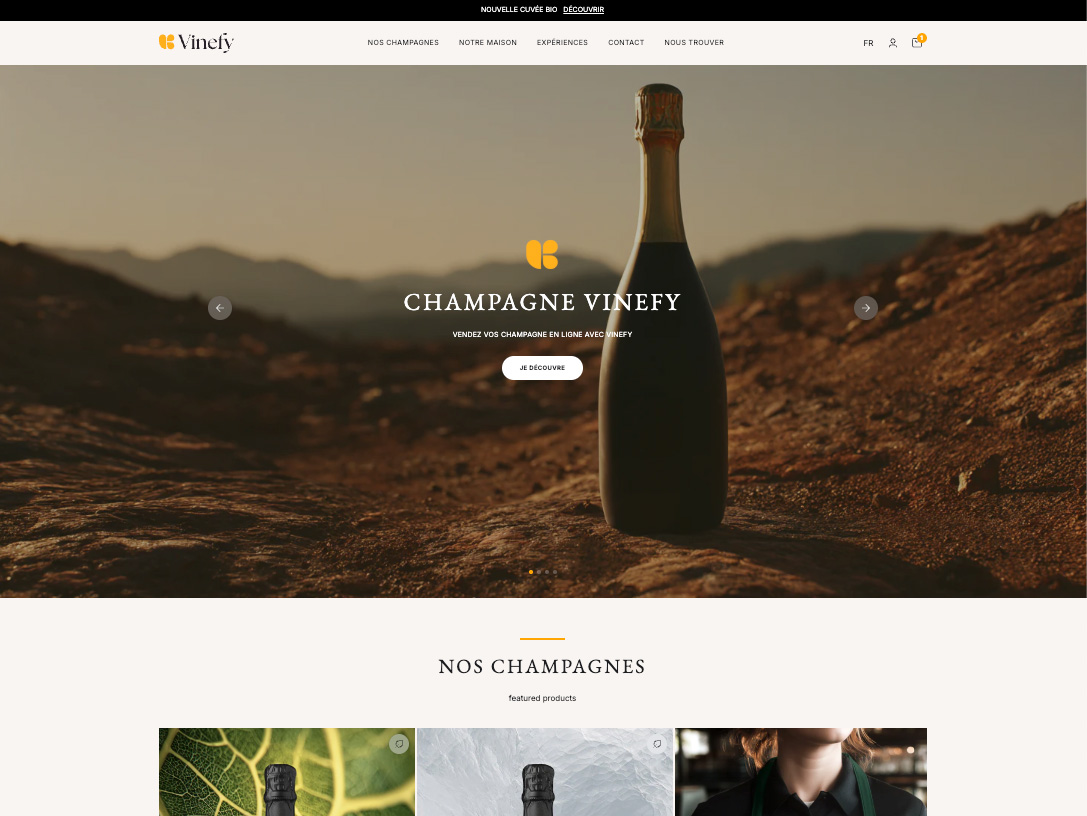 Le thème Shopify pensé pour les vignerons champenois, les maisons de Champagne qui souhaitent vendre en direct et promouvoir leurs expériences.