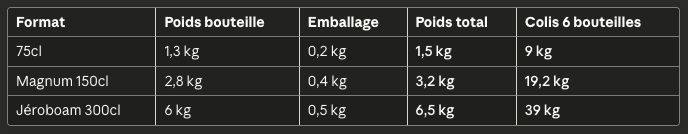 • Poids configuré sur TOUS vos produits (75cl = 1,5 kg)